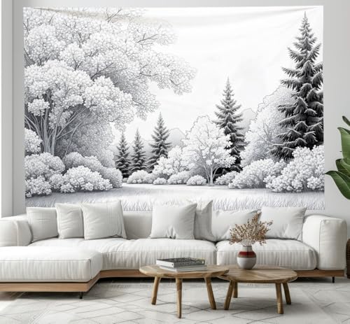 Tapisserie Murale Forêt De Plantes Peinte À La Main Tenture La Grande Paysage Rétro Deco Tenture Murale Poster 3D Effet Noir Et Blanc Peinture Murales Tissu Estampes Pour Chambre Salon 150X130Cm