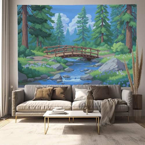 Tapisserie Murale Paysage Forestier De Dessin Animé Tenture La Grande Pont En Bois Rivière Deco Tenture Murale Poster 3D Effet Bleu-Vert Peinture Murales Tissu Estampes Pour Chambre Salon 150X130Cm