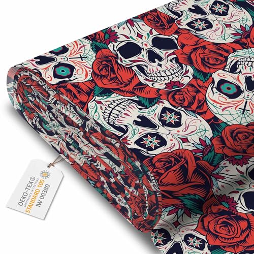 DreamRoots Tissu imperméable extérieur au metre 160 cm Largeur - Toile exterieure impermeable 100% de polyester 600D 220g/m - Tissus au metre ameublement Red Roses Skull mètre linéaire