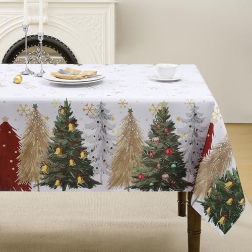FIBORIA Nappe Noel Rectangulaire 180 x 140 cm Vert à sapins colorés et Flocons de Neige Nappes Anti Tache Tissu Décor de Table pour extérieurs, Jardin, fêtes, Mariage, Buffet, Nouvel an