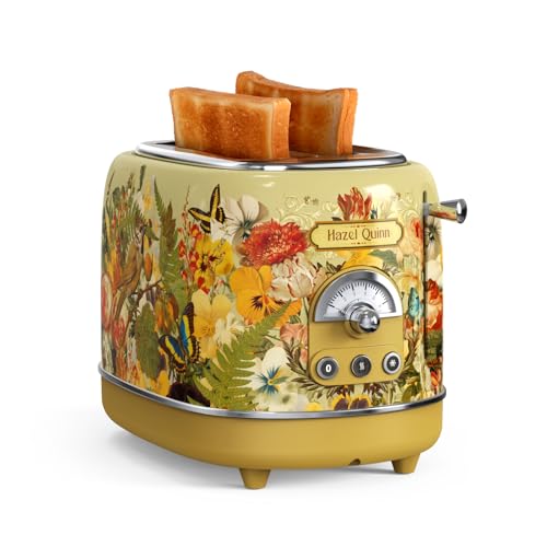 Hazel Quinn Grille Pain Vintage, Double Fente de 38 mm de Large, Toaster avec 3 Fonctions et 6 Niveaux de Cuisson, Plateau Ramasse-Miettes Amovible, Acier Inoxydable, 815W - Jaune Imprimé
