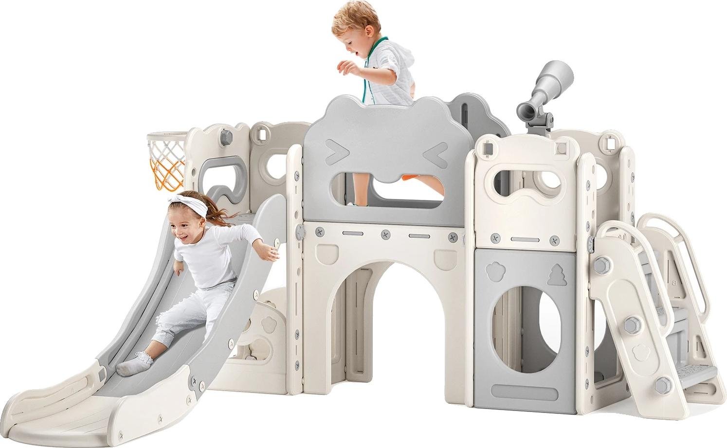 Toboggan pour Enfants 11 en 1 en Forme d'élan avec Panier de Basket, Golf, télescope, Structure d'escalade,Toboggan d'intérieur pour Enfants,Jouets d'aire de Jeux Montessori(Beige-Gris)