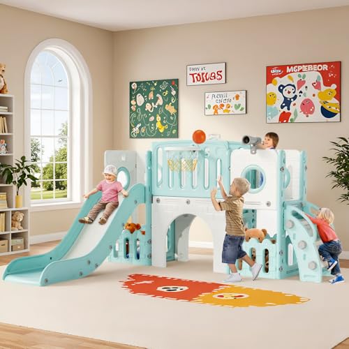 Garvee Toboggan pour Enfant 8 en 1, Ensemble Toboggan avec Espace de Cache-Cache, Échelle d'escalade, Panier de Basket, Télescope et Tunnel de Jeu pour Enfants Aire de Jeux (Bleu)