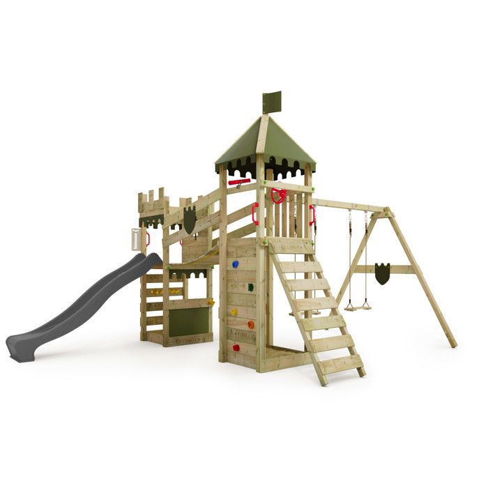 Fatmoose Aire de Jeux Château Fort RiverRun Royal XXL avec balançoire & Toboggan Anthracite, extérieur Enfants Tour d'escalade avec bac à Sable échelle & Accessoires de Jeux