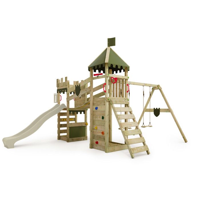 Fatmoose Aire de Jeux Château Fort RiverRun Royal XXL avec SurfSwing, balançoire & Toboggan Vert, extérieur Enfants Tour d'escalade avec bac à Sable échelle & Accessoires de Jeux