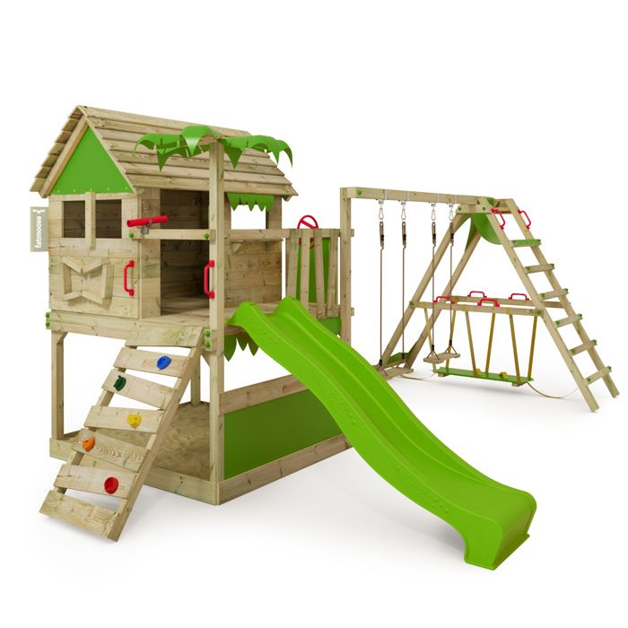 Tour de jeux bois FATMOOSE BoldBaron XXL avec SurfSwing toboggan 220 cm vert pomme et mur d’escalade – 10 ans de garantie*