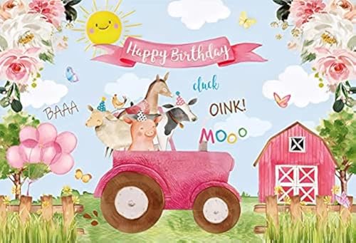 Renaiss 2.2x1.5m Dessin animé Ferme Toile de Fond Animaux Joyeux Anniversaire Photographie Fond Rose Fleurs Grange Camion clôture Enfants fête gâteau Table décoration Studio Stand Accessoires