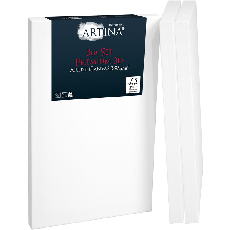 3D Toile Peinture sur Châssis Bois pour Toile Fait de 100% de Coton 380g/ m² - Toile Vierge 3 Fois Peinte au préalable - Lot de 3 20cm, 30cm - Artina