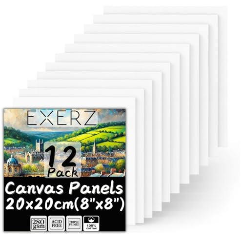 Exerz 20x20cm Panneaux de Toile 12pcs, Cartons entoilés, Tableaux en Toile à Peindre, 3mm d'épaisseur 280GSM, 100% Coton,Vierge, Triple apprêt, Sans Acide, Grain Moyen