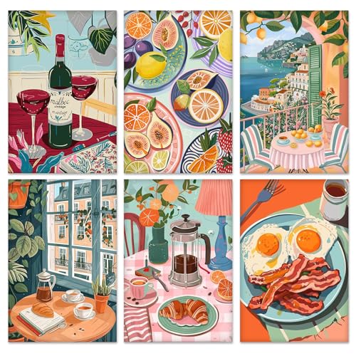 QENSPE Lot de 6 Kit Peinture par Numéros, Toiles Tendues Peinture Acrylique pour Adultes, Débutants et Étudiants, Fournitures pour Soirées Dessin, Café & Nourriture (20x30 cm)