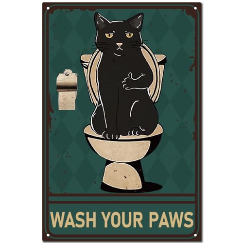 CREATCABIN Panneau Métal Vintage Forme Chat Noir Salle Bain,Affiche d'art Mural,Outil Fermeture,Plaque Peinture Rétro,Décoration Murale,Cadeau pour Amoureux Chats,Toilettes,30x20cm,Lavez Vos Pattes
