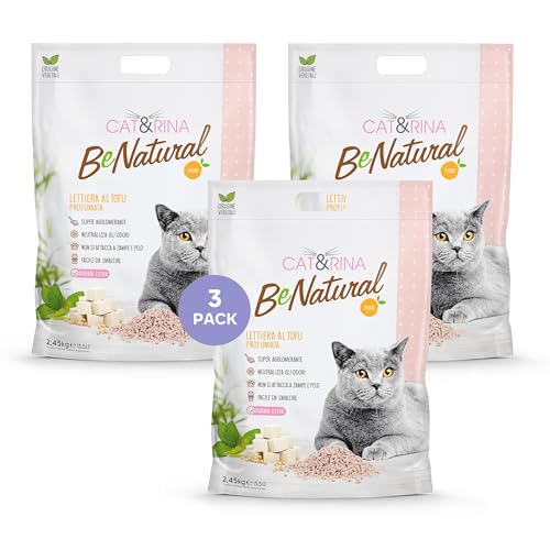 Cat&Rina BeNatural, litière pour Chat au Tofu 5,5 l Agglomérant et végétal. Jusqu'à 30 Jours d'utilisation. Se débarrasse dans Les bios ou Les Toilettes. Sable Chats Anti-odeurs Pêche, 3 pièces
