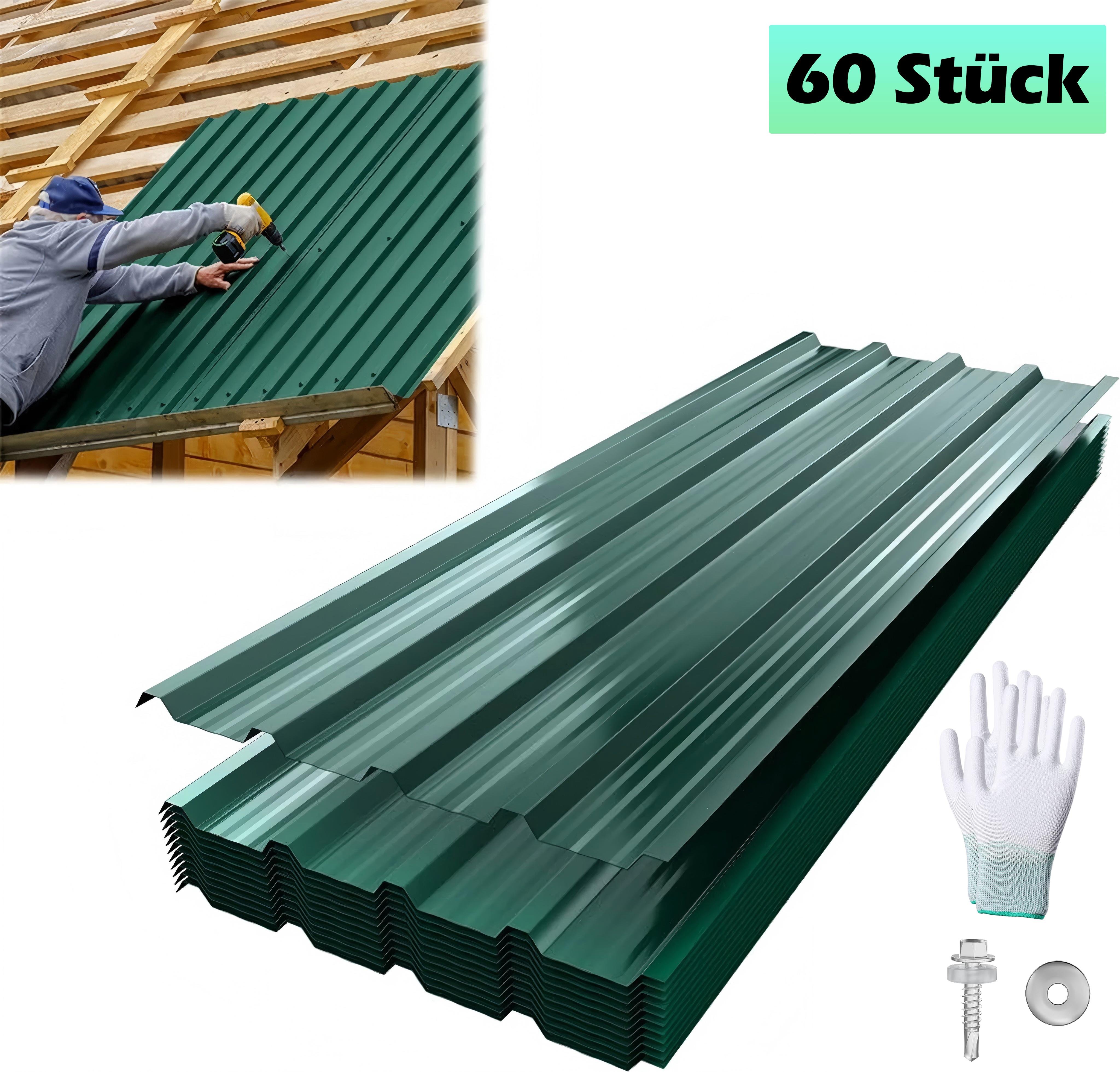 YUENFONG 60 tôles trapézoïdales métalliques pour toiture, 35 m², tôles trapézoïdales ondulées pour toiture, 129 cm x 45 cm, tôle galvanisée pour la construction de toitures de garages, vert