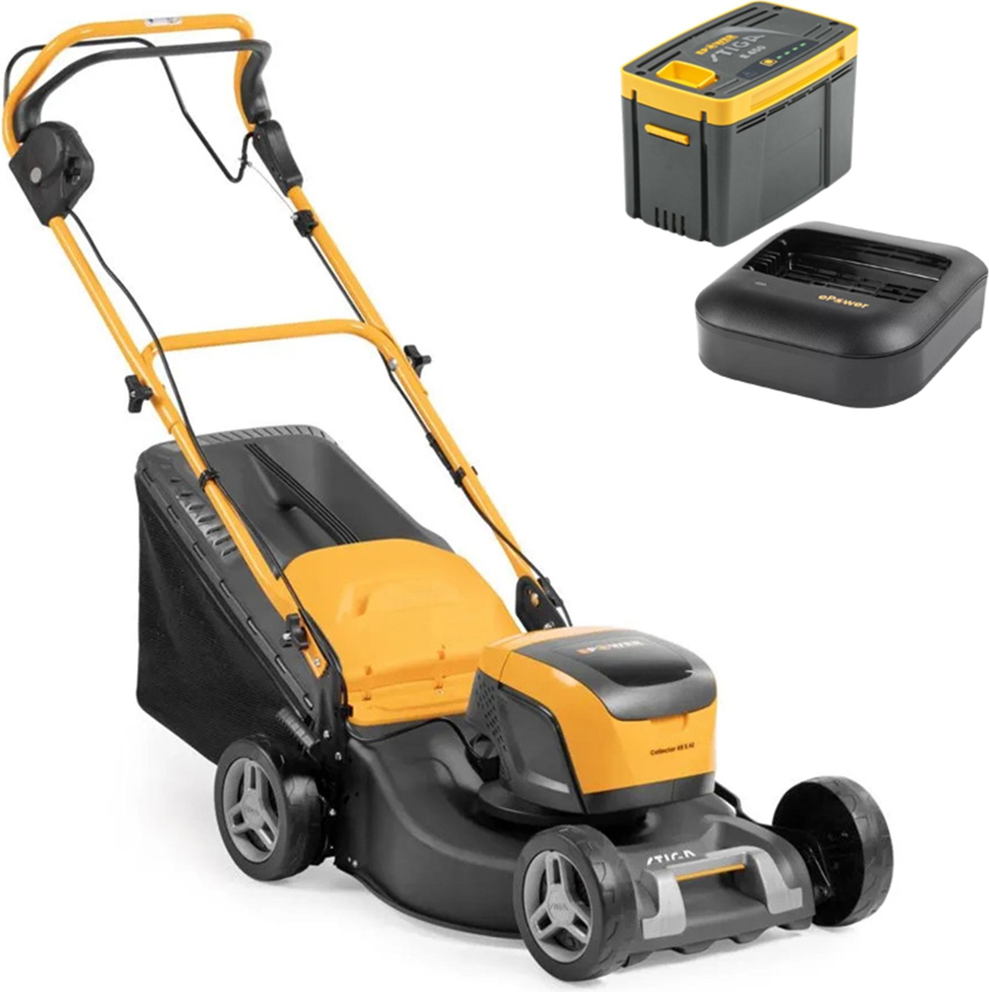 STIGA Collector 48 S AE Kit - Tondeuse à gazon avec batterie de 48 V et 5 Ah, largeur de coupe 46 cm, panier de 60 L, moteur brushless, autotractée