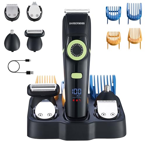 BarberBoss Kit de toilettage visage 3-en-1 pour homme : Tondeuse à cheveux, à barbe et de précision avec molette de précision, 4 peignes, chargeur USB, écran LED, Tondeuse visage et corps pour homme