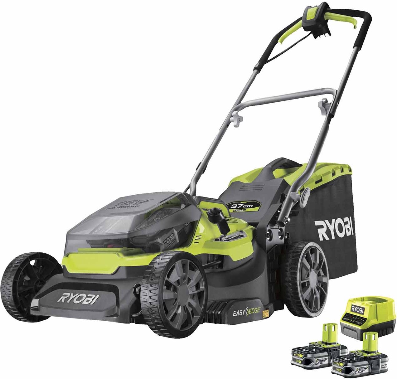 RYOBI Tondeuse à gazon hybride RY18LMH37A-225 18V 2,5Ah, Tondeuse à gazon sans fil, Mulching sans fil, largeur de coupe 37 cm