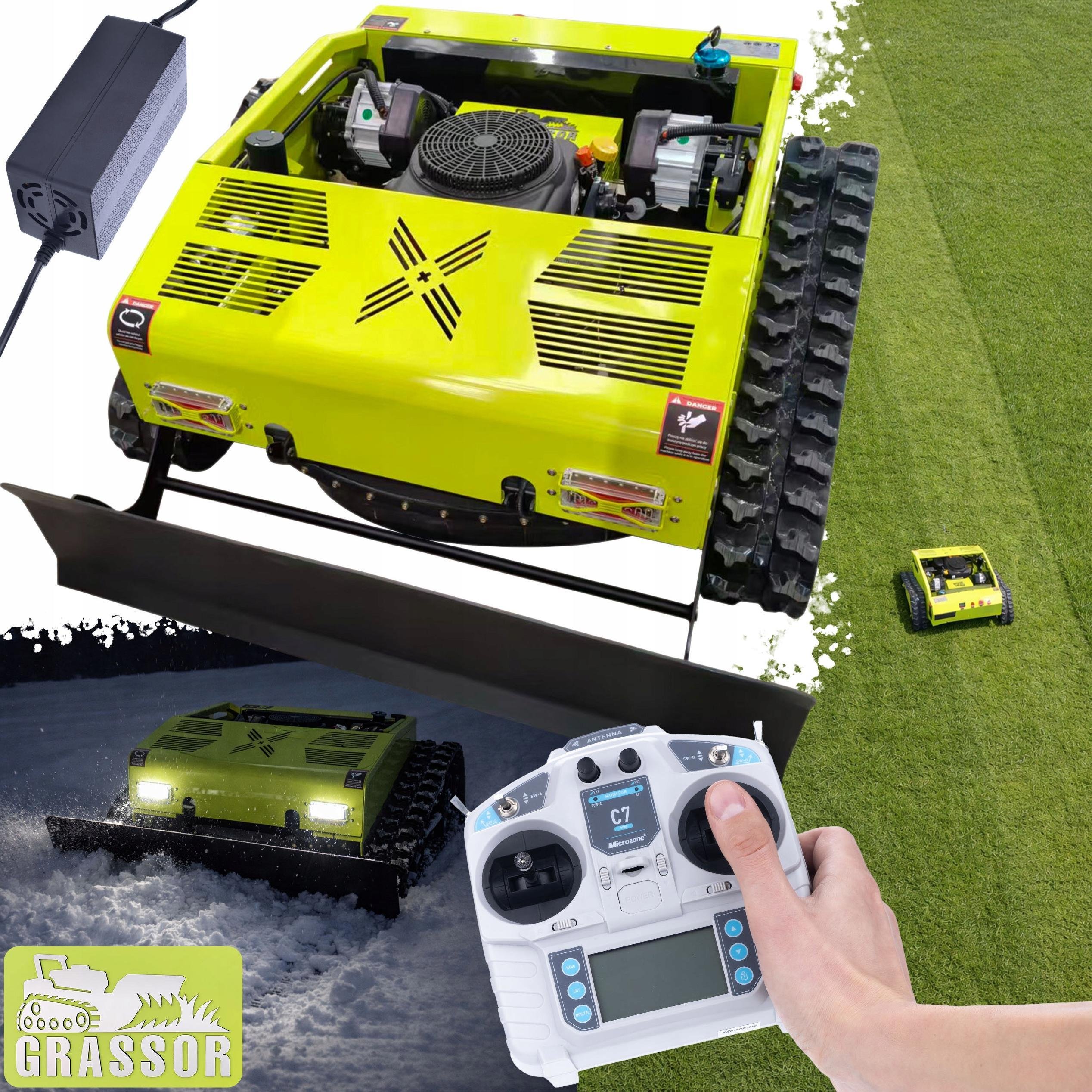 Tondeuse à Gazon Télécommandée avec Lame à Neige, Tondeuse sur Chenilles Hybride Essence-Électrique 4x4, Débroussailleuse Intégrée pour Terrain Accidenté