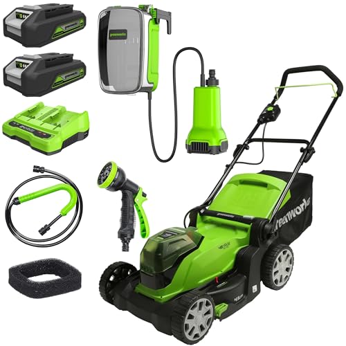 Greenworks 48V (2x24V) Tondeuse à Gazon sans Fil, Largeur de Coupe 36 cm,2 Batteries de 24V 2Ah et Chargeur + Greenworks G24SWP Pompe à Eau Submersible, sans Batterie 24V Ni Chargeur, Garantie 3 Ans