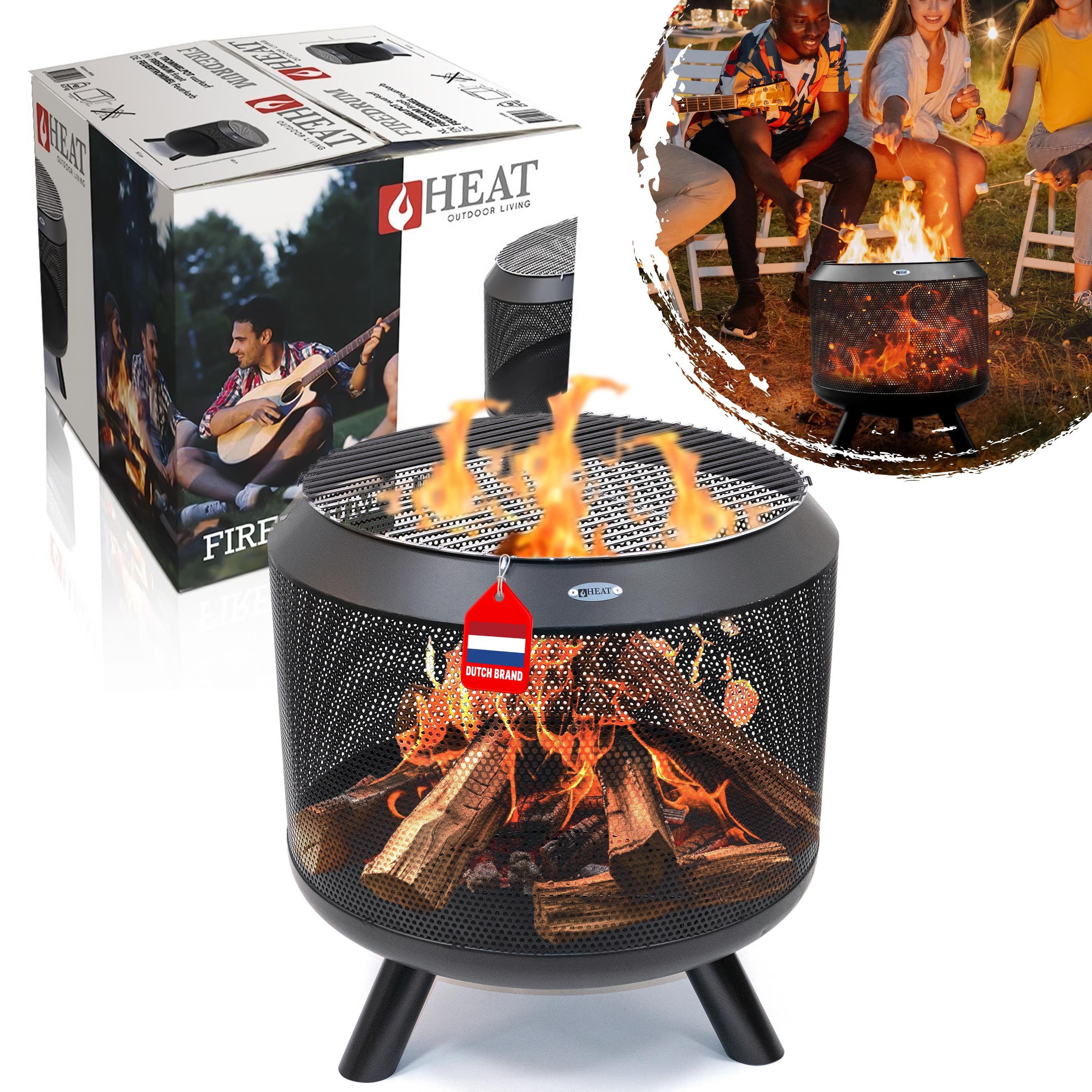 HEAT Outdoor Living Trommel Noir - Corbeille à feu pour le jardin - Tonneau à feu & foyer - Corbeille à feu en acier stable pour des soirées détendues - Corbeille à feu sur pieds - Corbeille à feu avec barbecue Noir