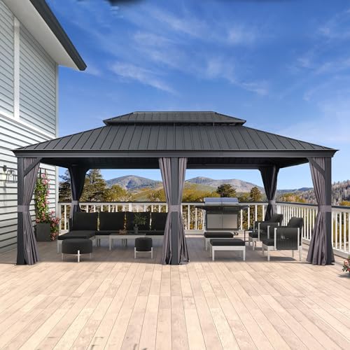 PURPLE LEAF Tonnelle de Jardin Exterieur 4,25 x 3,65 m Pergola Aluminium avec Moustiquaire et Rideaux Pavillon de Jardin à Double Toit Acier Galvanisé, Gris