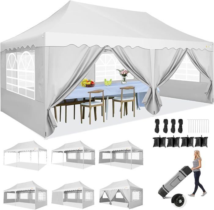 Tonnelle de Jardin Tonnelle Pliante Imperméable Tente de Reception 3X6m avec 4 Parois aux UV Pavillon Blanc Bâche PE Epaisse de env pour Fête Marriage Les Activités Commerciales