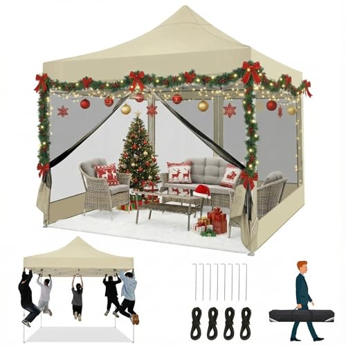 JUMMICO Tonnelle de Jardin Exterieur 3,24x3,24m avec Moustiquaire,Tonnelle Pliante Imperméable Barnum UV50+,Tonnelle Pop up Tente de Réception Sac Roulant pour Camping Pique-Nique Fête,Brun
