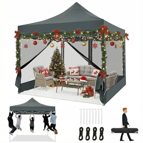 VOUNOT Tonnelle de Jardin Pliante 3 * 3m Renforcé avec 4 Parois Mur fenêtre Tente en Polyester Imperméable pour Festival Jardin Camping Sac de Transport et Sacs de Sable Inclus Gris