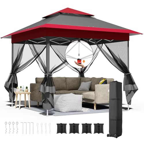Tonnelle Pliante 3,3 x 3,3 imperméable, avec 4 Toiles Moustiquaires, One Push Tonnelle de Jardin, Tente de fête à Double Toit, 4 PCS Sacs de Sable, pour terrasse/marché/Camping/Plage, Rouge Gris