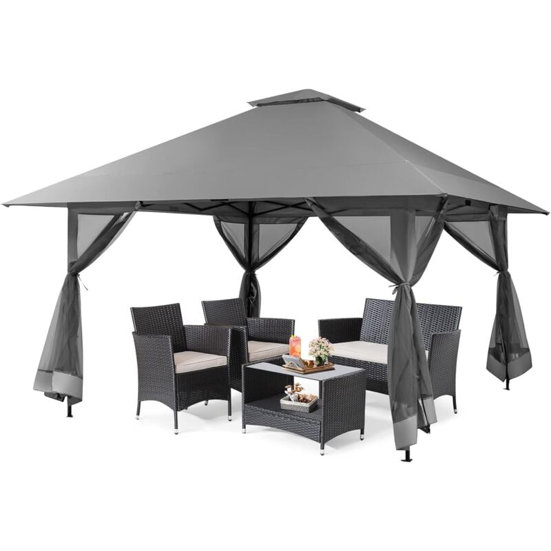 Tonnelle pop-up 4×4 m – pavillon de jardin double toit, protection UV, murs en maille anti-insectes, résistant aux intempéries, gris foncé
