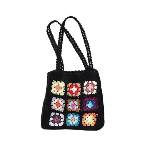 BGHYJKOL Sac Artisanal Crochet Floral Handmade Crochet Weaving Bag Summer Retro Grid Shoulder Mixed Color Flower Block Handbag Leisure Top-Handle(Black)