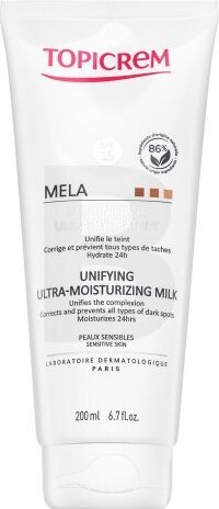 Topicrem - Mela, Lait Unifiant Ultra Hydratant Corps - Hydrate 24h, Unifie le Teint, Corrige et Prévient l’Apparition des Taches - Texture Onctueuse - Peaux Sensibles - Nouvelle Formule 200ml