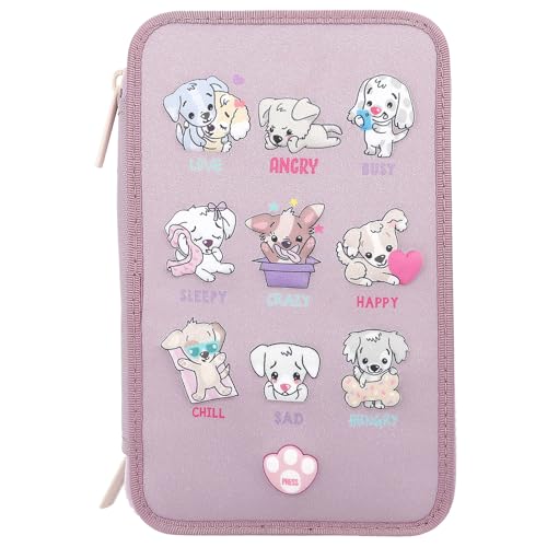 Depesche 12843 TOPModel - Trousse à Crayons 3 Compartiments remplie en Violet, avec des Motifs de LED et de Chiens, Trousse à Crayons avec des Crayons de Couleur, Une règle