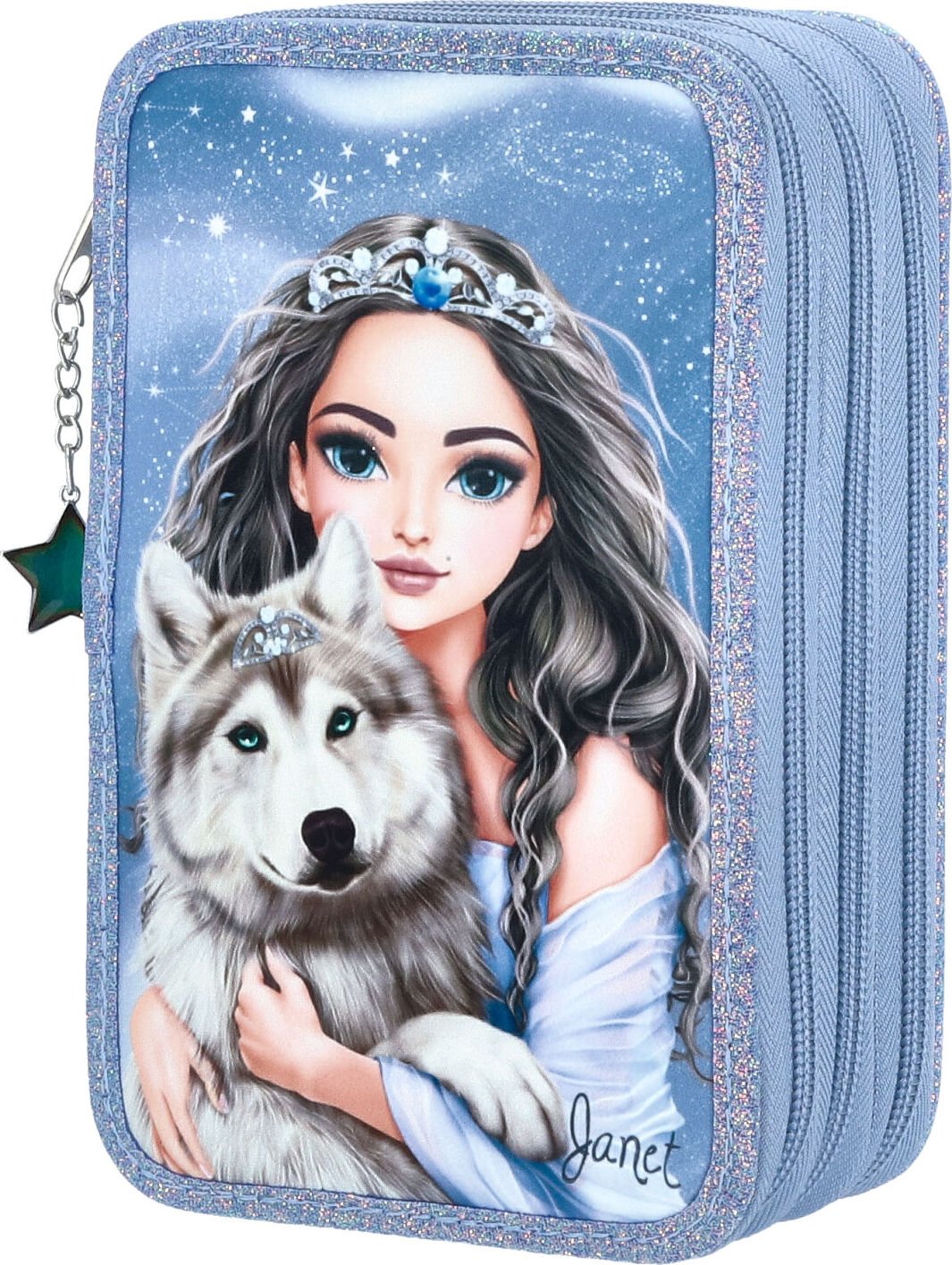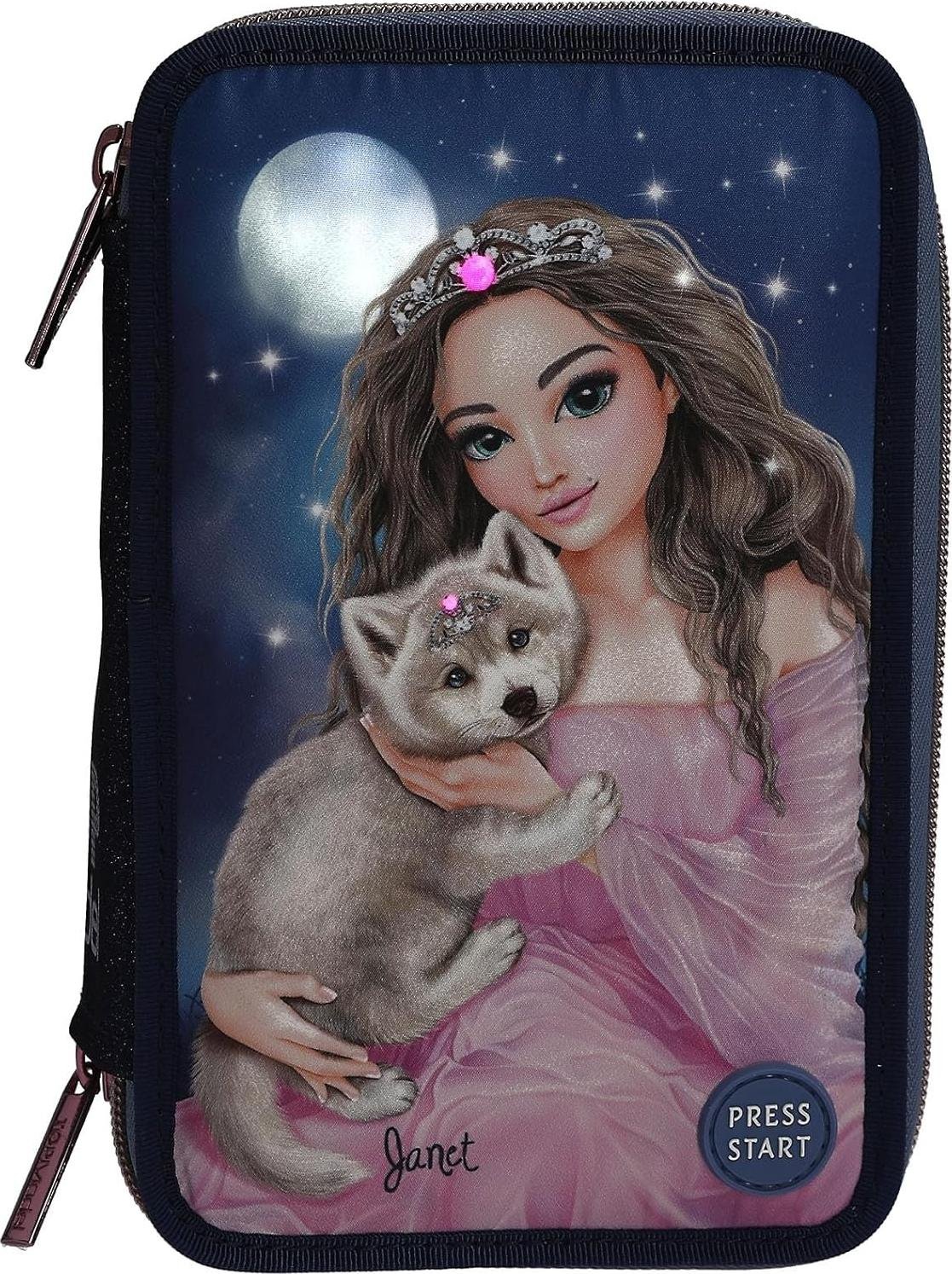 Depesche 13149 TOPModel Wolf - Trousse à Crayons remplie à 3 Compartiments en Bleu foncé, avec Motif de modèle, étoiles et Paillettes, Trousse à Crayons avec Crayons de Couleur et Bien Plus Encore