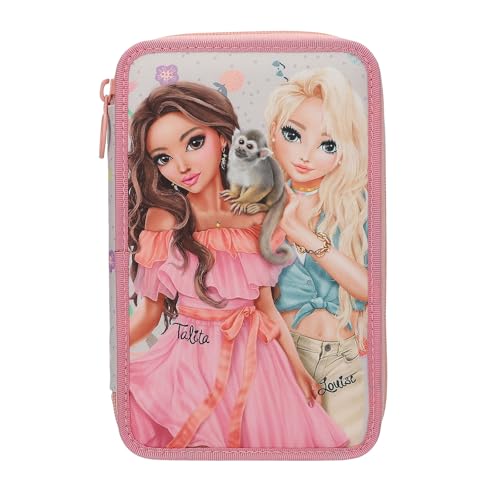 Depesche 13324 TOPModel Juicy - Trousse à Crayons remplie à 3 Compartiments, crème et Rose, avec Motif de modèle, Petit Singe et Motif coloré, avec Crayons de Couleur, Ciseaux, règle, etc.