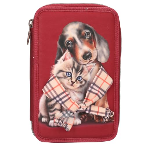 Depesche 13674 TOPModel Fur Ever Friends - Trousse à Crayons remplie à 2 Compartiments en Rouge foncé, avec Motif Chien et Chat, avec Crayons de Couleur, Ciseaux, règle, etc.