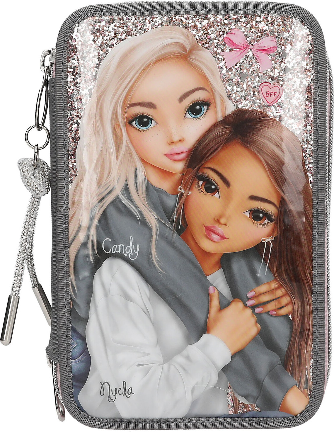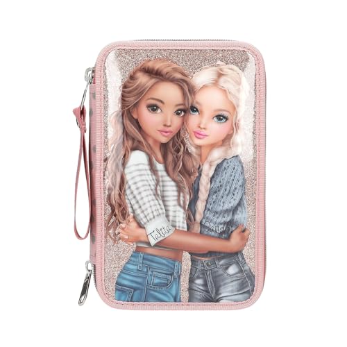 Depesche 13315 TOPModel My BFF - Trousse à Crayons remplie à 3 Compartiments en Gris et Rose, avec Motif de modèle et Paillettes, à Crayons avec Crayons de Couleur, Ciseaux, règle et Bien Plus Encore