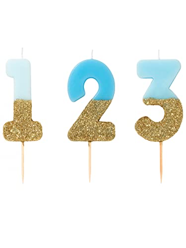 Talking Tables Bougie Anniversaire | Bougies Gâteau Anniversaire | Bougies Anniversaire Originales | Bougie Bleue | Bougie Chiffre 3 | Topper Gâteau Anniversaire | Paillettes Or et Bleu
