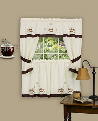 Achim Home Furnishings 58-inch by 36-inch Cuppa Joe Embellished Cottage Topper with 58-inch by 36-inch Swaggers for Windows