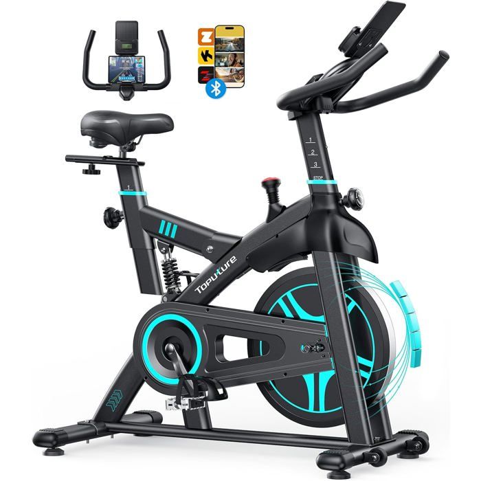 TOPUTURE Velo d appartement,Vélo d'appartement connecté APP, 0-100% Résistance réglable,Vélo d'exercice silencieux d'intérieur,Velo appartement avec Système d’Amortissement,Capacité 160 kg