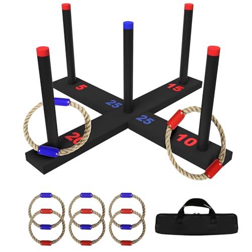 Gissroys Jeu de lancer de pneus en bois pour toutes les époques, 6 toupies à double boule, 4 difficultés amusantes, plan solide durable, sac de rangement portable, époques, arrière-cour