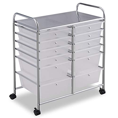 COSTWAY Chariot de Rangement à Roulette 12 Tiroirs en PP, Tour de Rangement avec Tablette, Cadre en Métal, Meuble Tiroir Desserte pour Cuisine, Salle de Bain, École, 64x38x75cm (Transparent)
