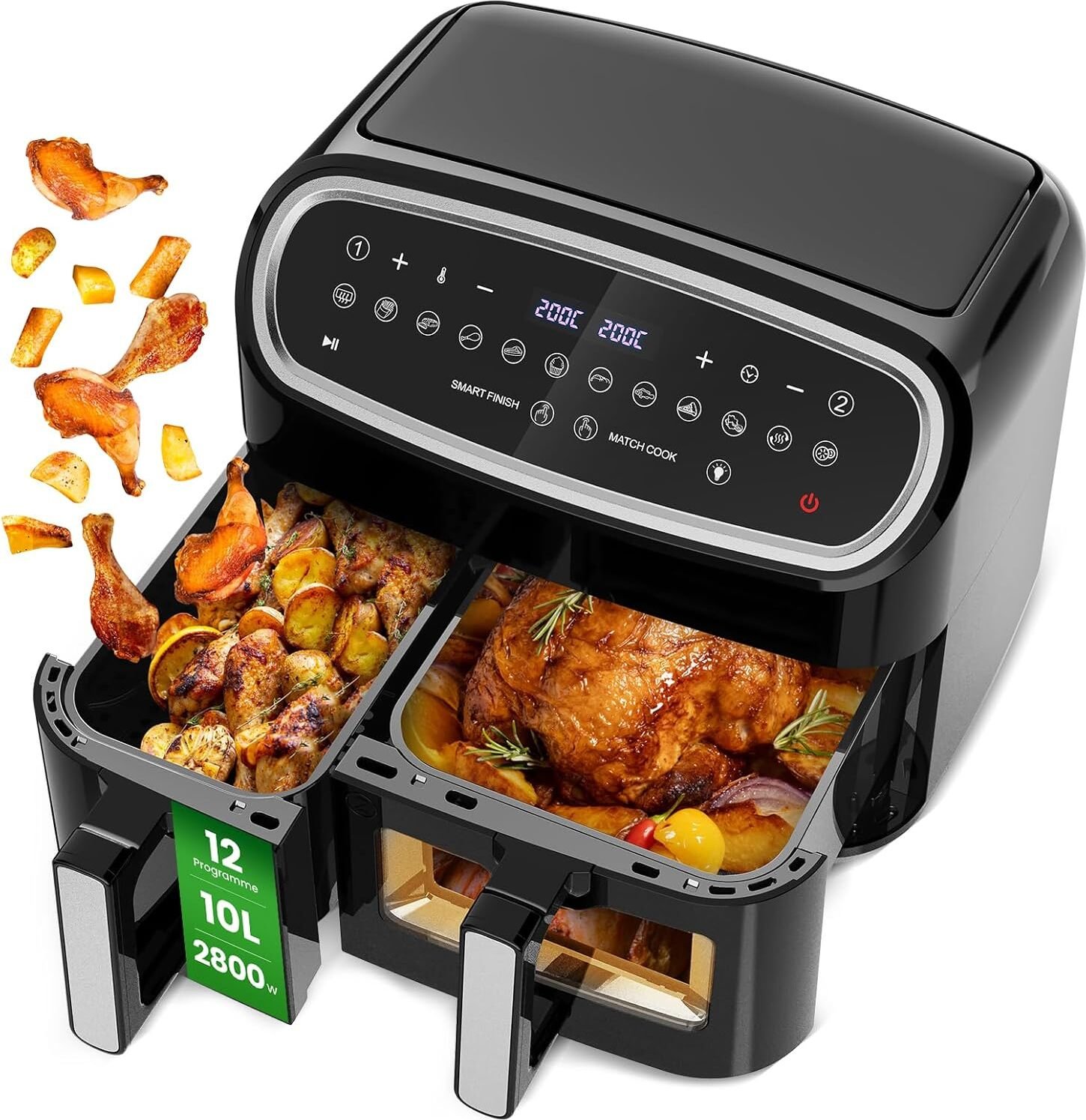 Friteuse Sans Huile Double, Air Fryer Tour, Capacité XXL de 10 Litres, 12 Programmes Préétablis, Fonction Minuterie, Friteuse à Air Chaud de 2800W, Double Tiroir pour Cuire un Poulet Entier
