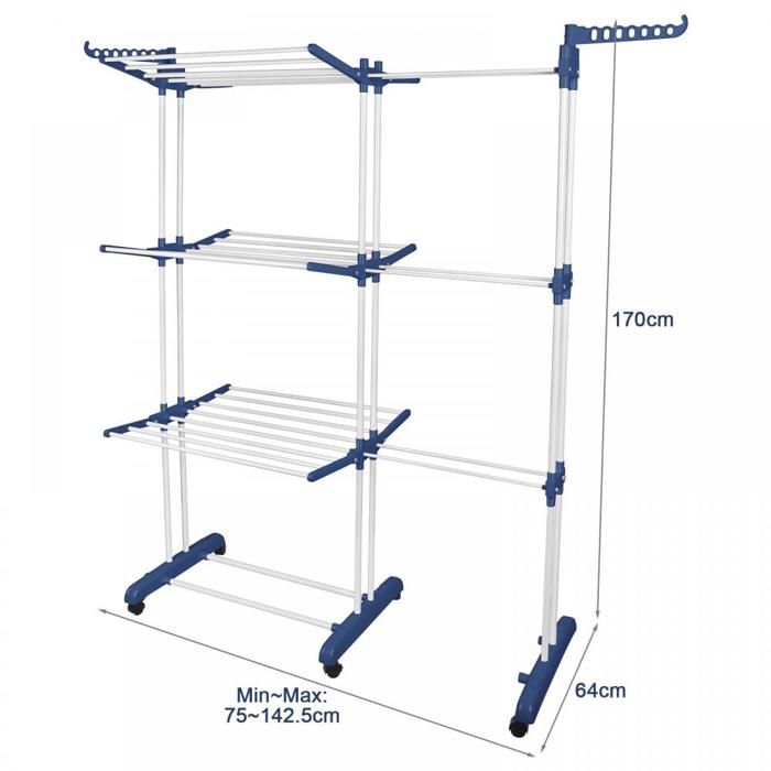 Amiremplie Etendoir type tour Etendoir à Linge Pliable pour intérieur Tiroir triple pour le séchage Plastique bleu + tube blanc