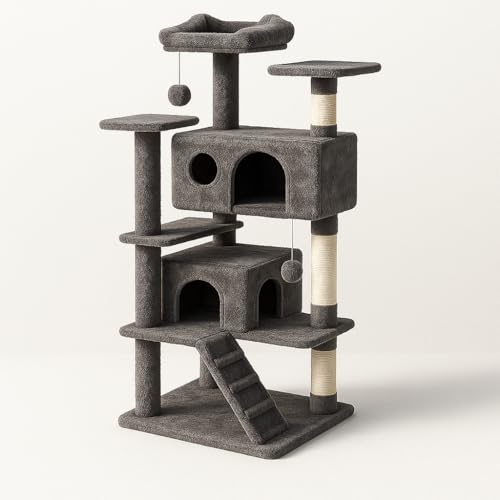 DUMOS Grand Arbre à Chat - 135 cm - Tour d'escalade - Arbre à Chat avec Grotte - Entièrement enveloppé de sisal - Arbre à Chat d'activités pour Chats de Tous âges (Gris foncé)