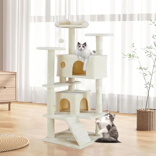 Yaheetech Arbre à Chat Multiniveau Tour pour Chat avec Cachettes Panier Perchoirs Rampe Poteaux en Sisal Boule Suspendue Tour d'escalade pour Chatons 145 cm de Haut Beige