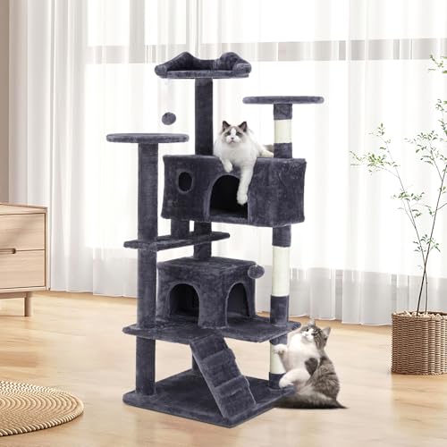 Yaheetech Arbre à Chat Multiniveau Tour pour Chat avec Cachettes Panier Perchoirs Rampe Poteaux en Sisal Boule Suspendue Tour d'escalade pour Chatons 145 cm de Haut Gris Foncé