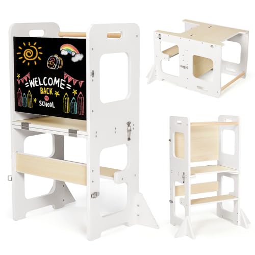 Labebe Tour d'apprentissage pour Enfants, Montessori 3 en 1 Tour d'observation, Pliable Tour d'apprentissage Tabouret avec Tableau Noir, Montessori Learning Tower À Partir de 18 Mois (Bois)
