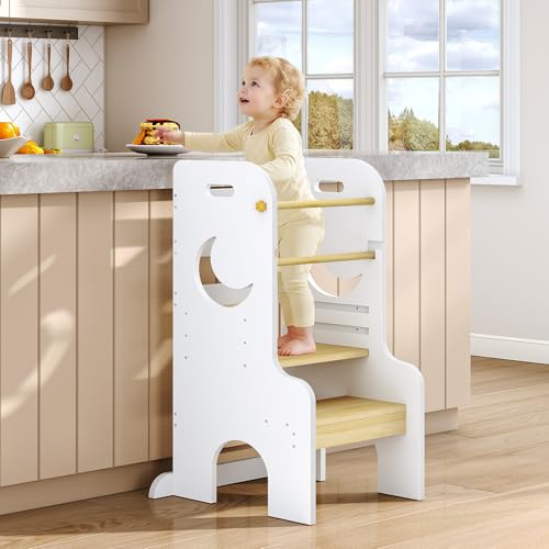 ComfortCove Tour d Observation Enfant, Tour D'observation Montessori, Chaise Montessori Enfant, Learning Tower, Marche Pied Bois, en Bois, Hauteur Réglable sur 3 Niveaux, Blanc/Chêne