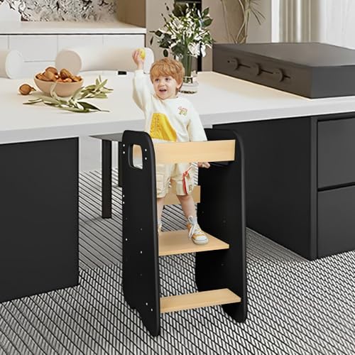 ComfortCove Tour d Observation Enfant, Tour D'observation Montessori, Chaise Montessori Enfant, Learning Tower, Marche Pied Bois, en Bois, Hauteur Réglable sur 3 Niveaux, Noir