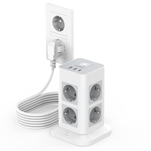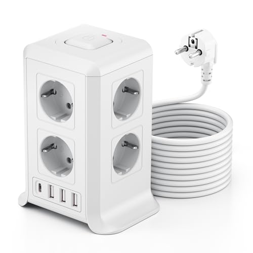 Sameriver Multiprise avec Interrupteur 5M(4000W/16A), 12 Prises et 3 USB A+1 USB C Tour Multiprise Parefoudre avec Interrupteurs Protection, Convient pour Le Salon, et Le Bureau Blanc, ZYC05